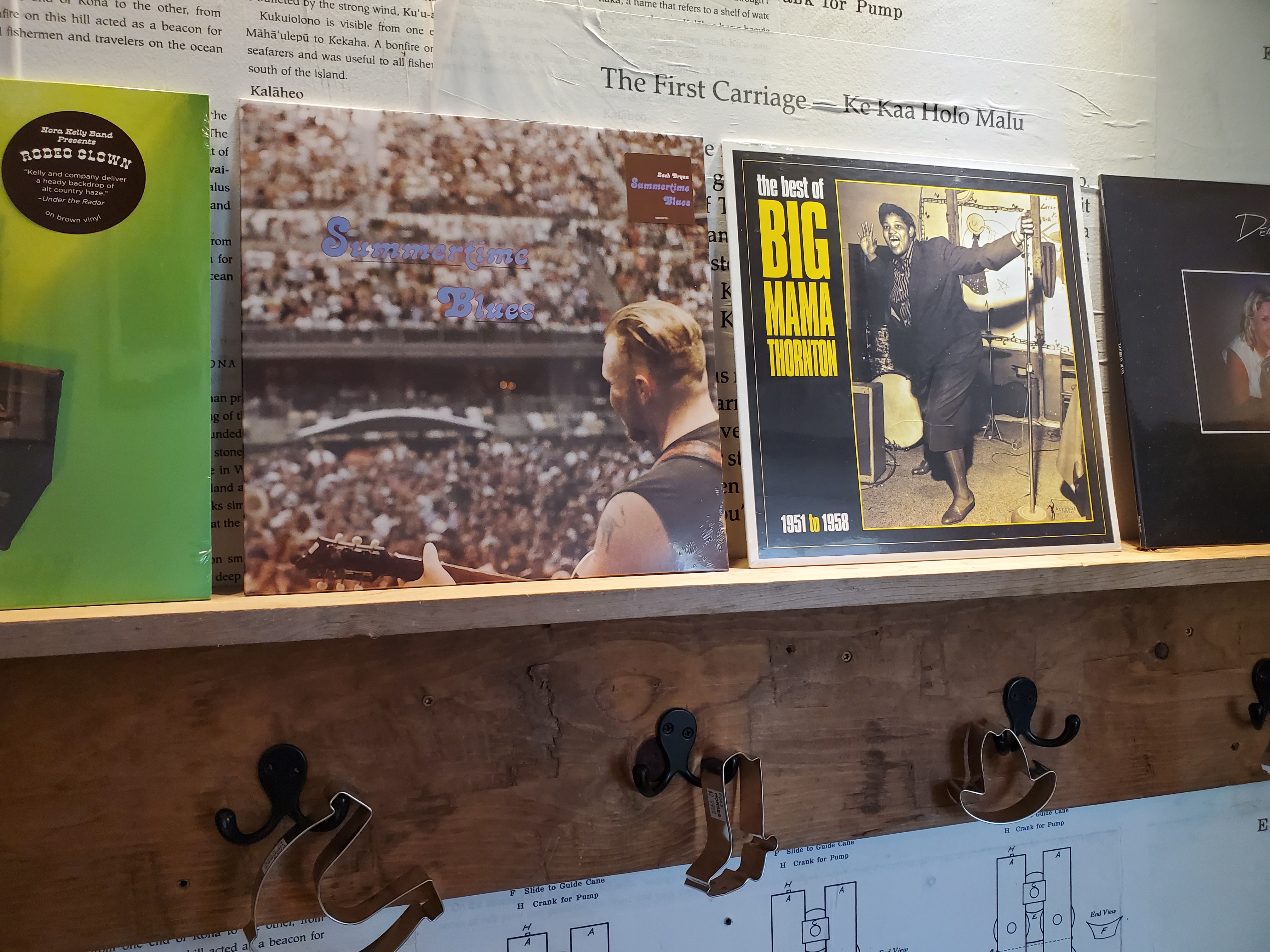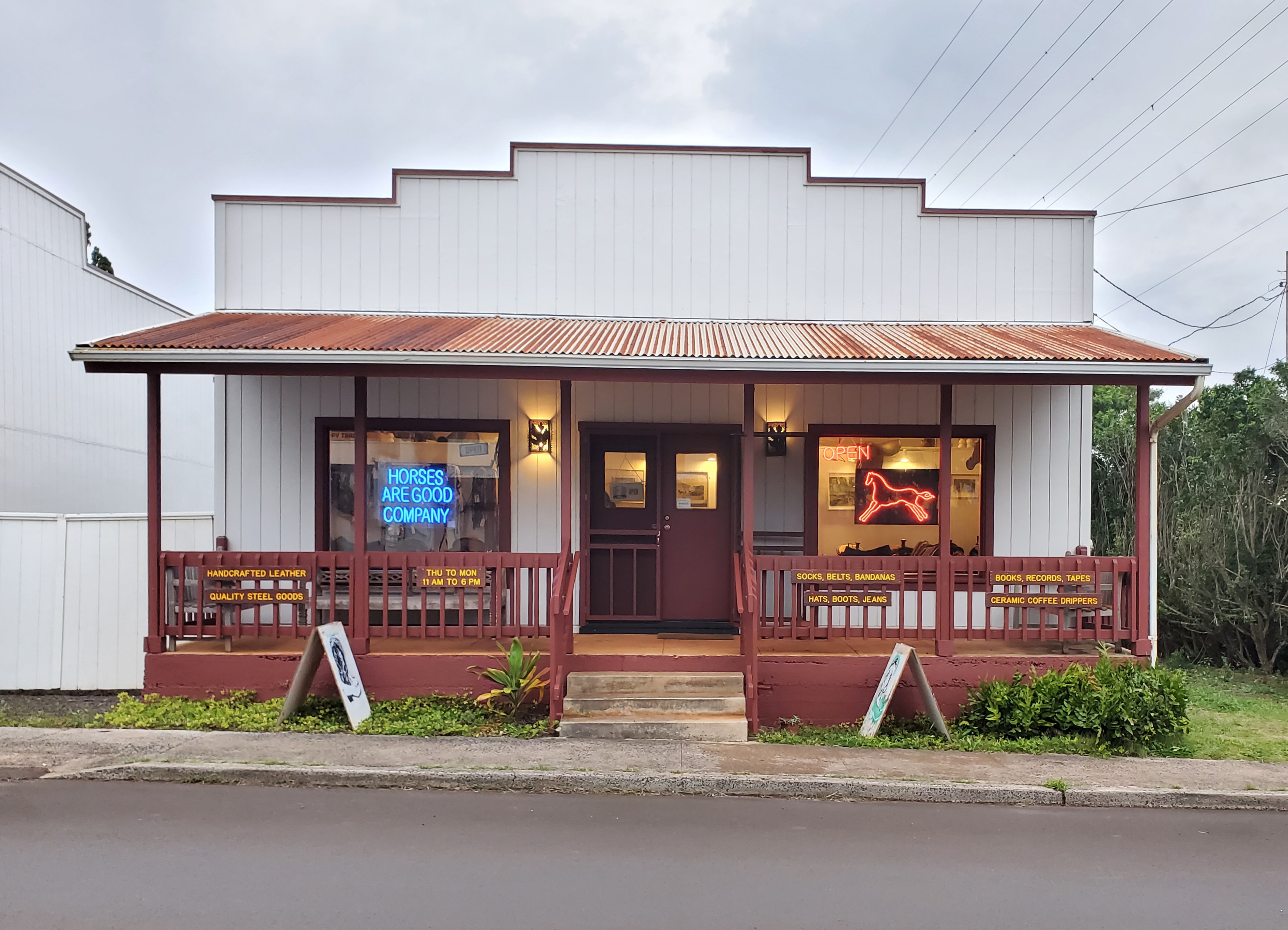 books about horses, magazines, vinyl records, cassette tapes, specialty soda, ceramic coffee drippers, kettles, glasses and mugs, knives, frying pans, pots, ladles, peelers, spatulas